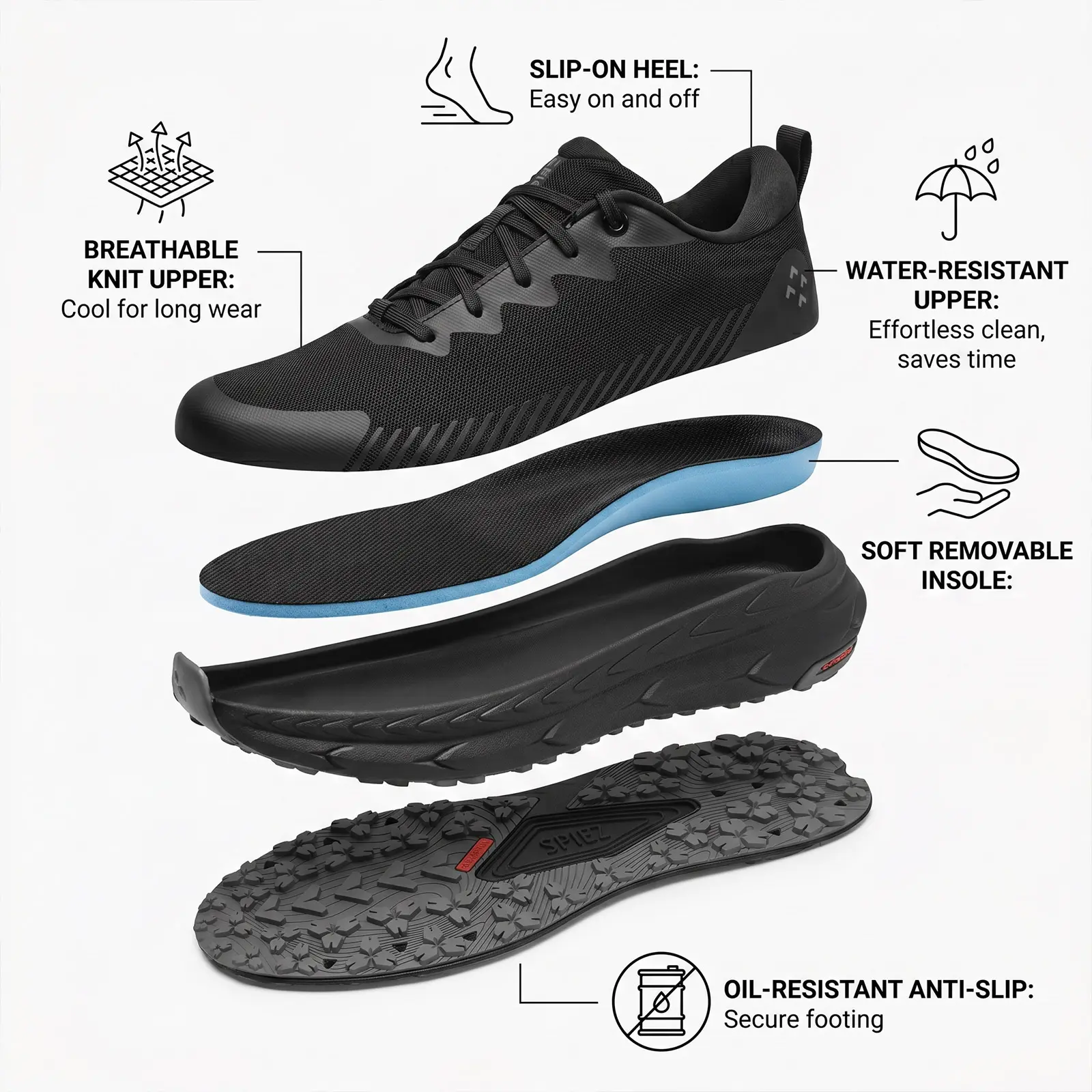 SPIEZ work shoes are oil-resistant, slip-resistant (SRC), and extremely lightweight—ideal for fast-paced kitchens and wet floors.